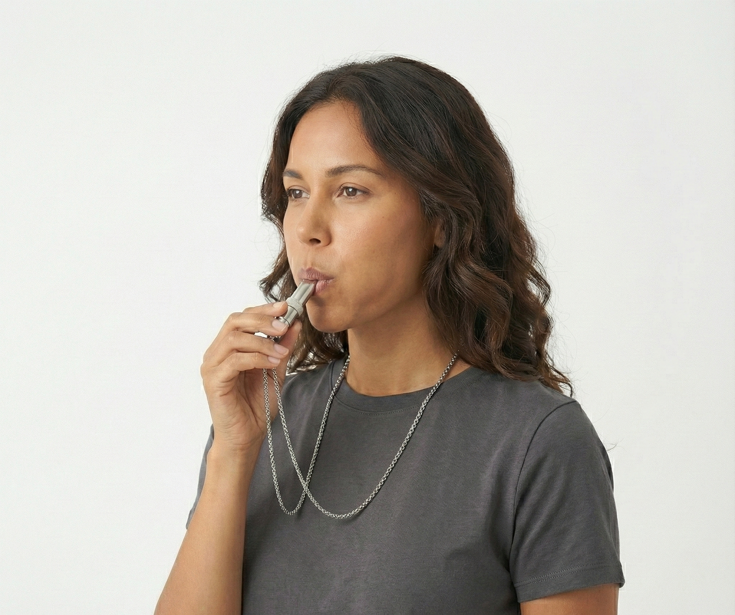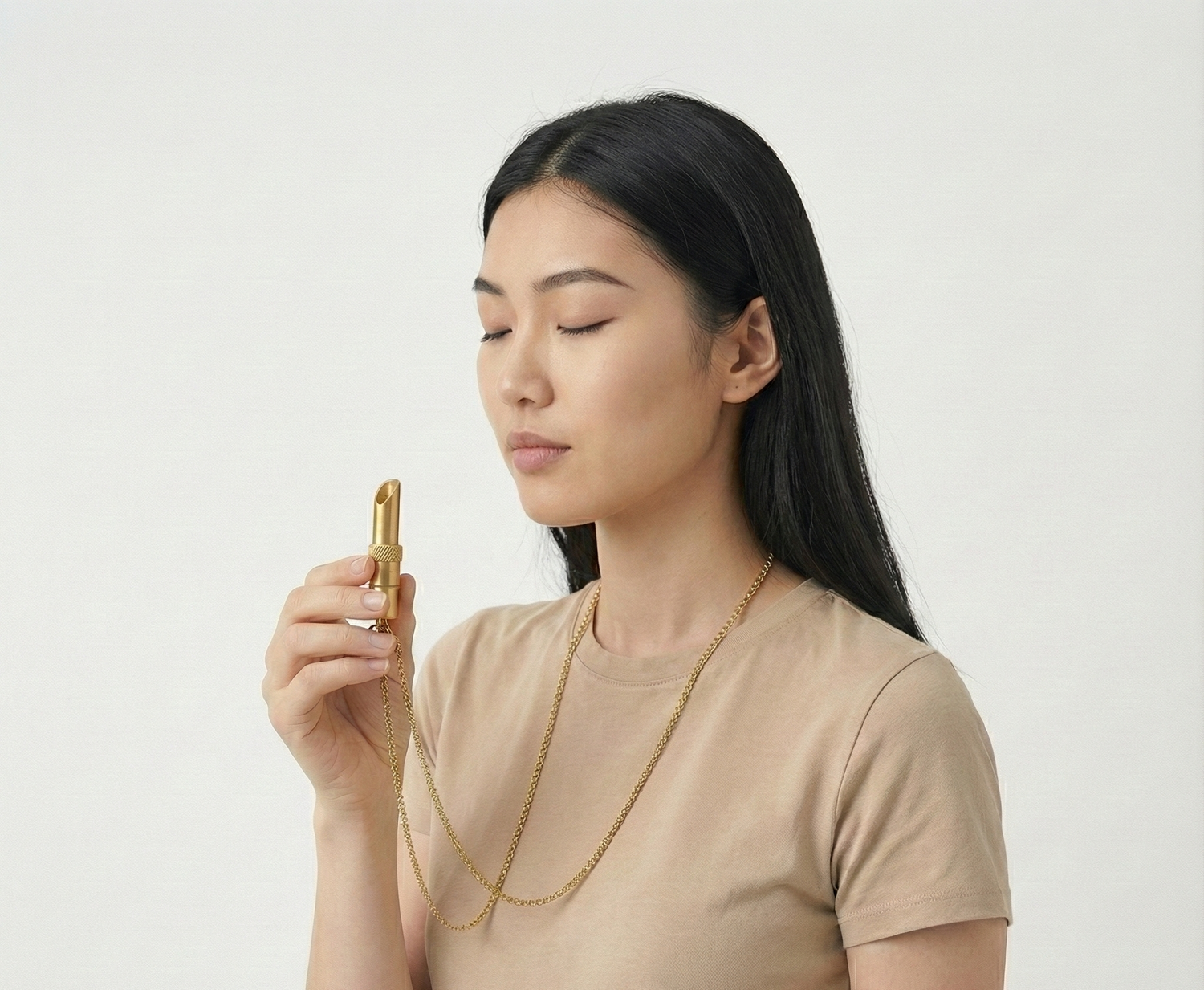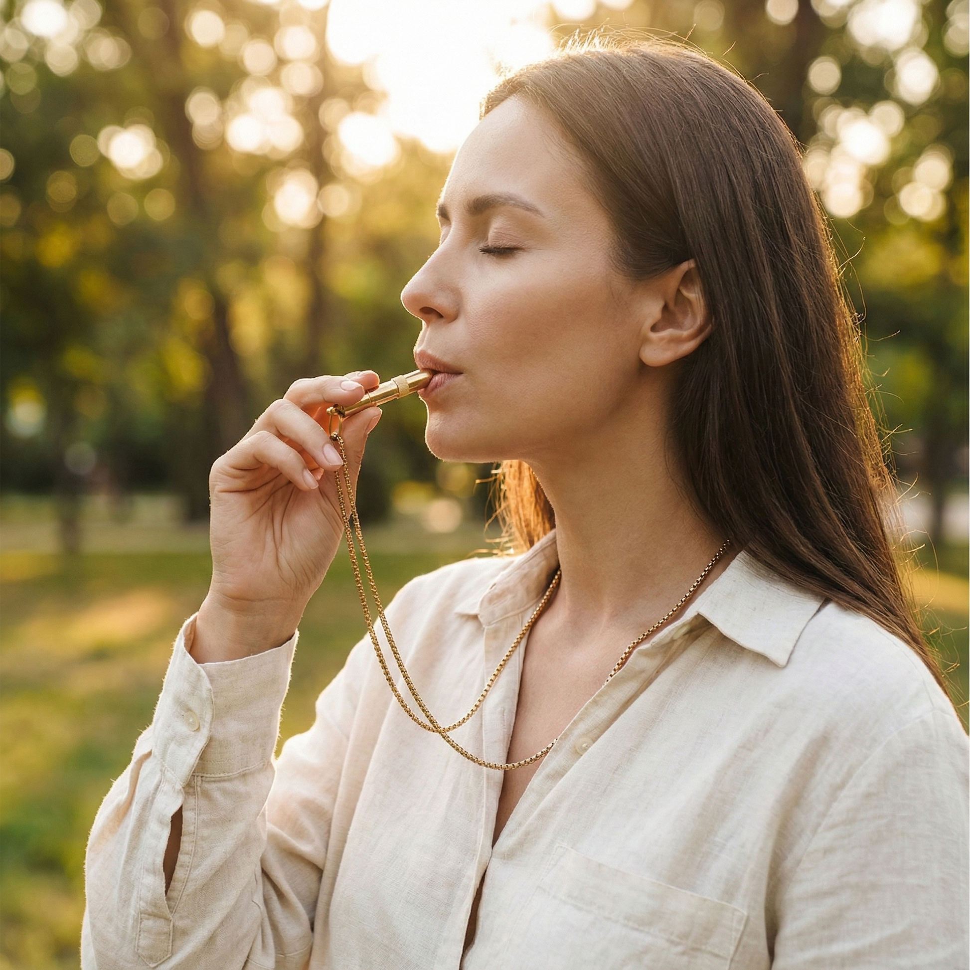 Atme nun gleichmäßig durch das Mundstück von SAIRO aus. Der sanfte Widerstand verlängert die Ausatmung automatisch – genau das Signal, das dein Nervensystem braucht, um Stress loszulassen und sich zu entspannen.
